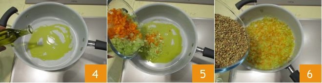 Pour the oil into a saucepan 4, add carrot, celery, and onion 5, and let them brown over medium heat for about 10 minutes. Meanwhile, rinse the lentils and add them to the soffritto 6.