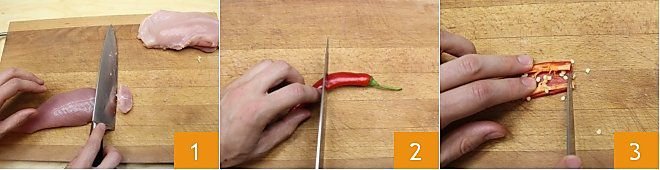 To prepare the lettuce cups with turkey salad, place the turkey breast on a cutting board and cut it into irregular bites 1. Then cut a fresh chili pepper in half 2, divide it again into two, and remove the seeds inside 3.