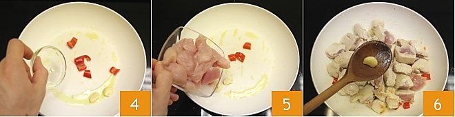 Then take a non-stick pan, heat a little oil, and add a peeled garlic clove with its internal germ removed. Add the chopped chili pepper to the garlic 4, and when they start to brown, add the turkey breast bites 5. Salt and pepper to taste, and remove the garlic clove when it has turned golden 6. Cook the bites for about 10 minutes, turning them from time to time to cook them thoroughly until they are well browned.
