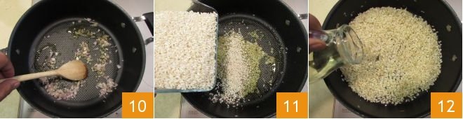 Pour a drizzle of oil into another pot, add the shallot 10 and let it soften over low heat. Add the rice 11 and toast it for 2-3 minutes, slightly raising the heat. Deglaze with white wine 12