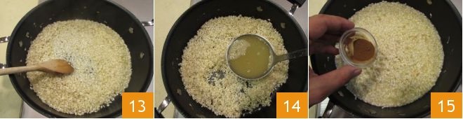 and let it completely evaporate, continuing to stir 13. Continue cooking the risotto by adding some shrimp broth 14. At this stage, it's best to stir the risotto as little as possible and add the broth a couple of ladles at a time, only as needed and always hot. After about 13 minutes, or until it's al dente, add the licorice powder 15.