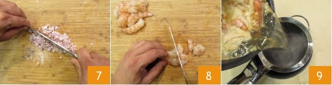Meanwhile, finely chop the shallot 7 and cut the shrimp into pieces 8. Then strain the broth and keep it warm 9.