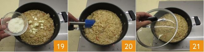 Wait about 3 minutes, then turn off the heat; then add: butter, pecorino 19 and mix them with the rest to cream the risotto 20. Cover with a lid 21 and wait a couple more minutes.