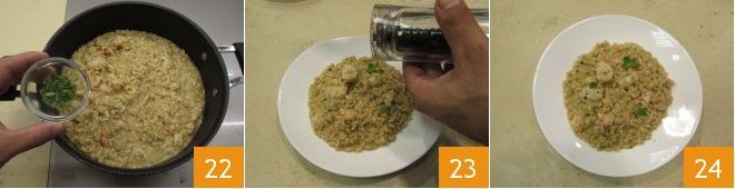Finish with freshly chopped oregano 22 and add a few more drops of broth to achieve the consistency you prefer. Plate, grate a bit of black pepper on each dish 23 and serve your licorice and shrimp risotto while still hot 24!