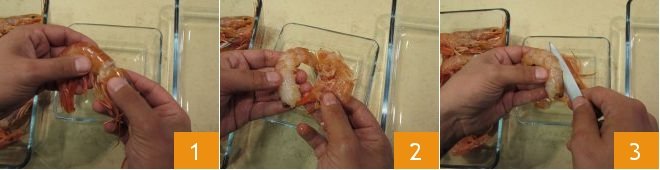 To prepare the licorice and shrimp risotto, first start by cleaning the shrimp. First, remove the head 1, then also remove the legs and shell 2, keeping everything aside. At this point, cut along the back of each shrimp 3 and remove the black vein. For more tips, check out our cooking school: How to clean shrimp.