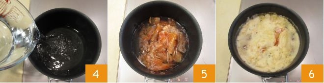 Then pour the water into a pot 4, add the heads and shells 5 and salt, then bring to a boil 6 and wait about 5 minutes.