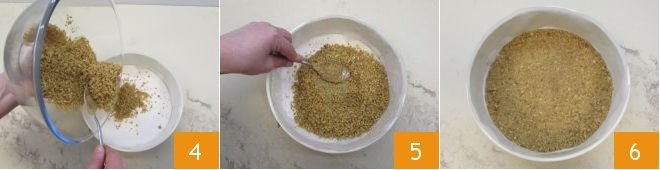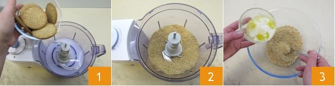 To prepare the light cheesecake, start by preparing the base: put the whole wheat cookies in a mixer 1, then finely chop them 2. Place the chopped cookies in a bowl. Now melt the butter in a small pan; gradually add the melted butter to the bowl with the chopped cookies 3 and mix well until you get a sandy mixture.