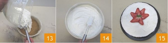 At this point, the cream is ready, pour it over the cookie base 13, now cold and compact. Smooth the cream to level it 14. Then place your light cheesecake in the refrigerator for at least 4 hours to set 15 and then serve it!