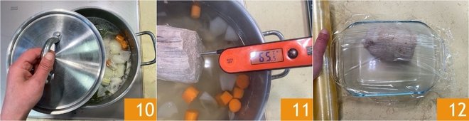 At this point, cover with a lid 10 and let it simmer for 30-35 minutes or until the meat reaches an internal temperature of 149°F 11. Once the meat is cooked, drain it and let it cool completely, covering with plastic wrap 12.