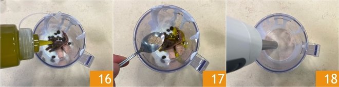 Add the capers, oil 16, white pepper 17, and blend until you obtain a smooth sauce 18.