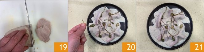 At this point, you can thinly slice the piece of veal 19 and plate it, garnishing with the sauce and caper flowers 20. Your light veal with tuna sauce is ready 21!