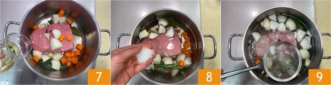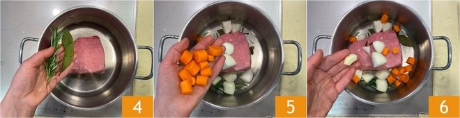 Then place the piece of meat in a large pot with water and season with bay leaf, rosemary 4, onion, carrot 5, cloves, and garlic 6.