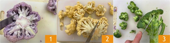 To prepare the light vegetarian lasagna, start by cleaning the cabbages: separate the florets from the purple cauliflower 1, then do the same with the yellow cauliflower 2 and the broccoli 3.