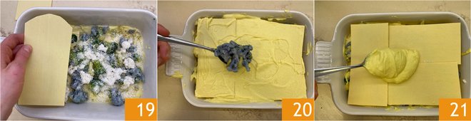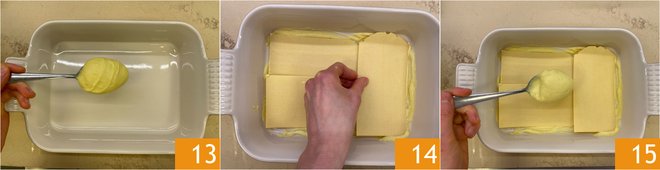 To assemble the lasagna, spread a little béchamel on the bottom of the baking dish 13, then lay the first layer of pasta sheets 14 and cover with more béchamel 15.