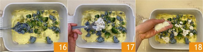 Distribute some of the cauliflower florets 16, then sprinkle with some crumbled plant-based mozzarella 17 and grated plant-based cheese 18.