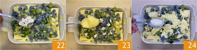 Repeat the layers in the same order: pasta sheets 19, vegan béchamel, vegetable mix 20 and cheeses. Make a third layer with pasta sheets and béchamel 21.