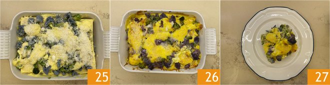 Add the remaining cauliflower and cheeses 22, then finish with the remaining béchamel 23 and plenty of grated cheese 24.