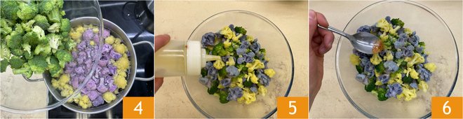 Drop all the florets into boiling water and cook for about 8–10 minutes 4. When they have softened, drain and season with oil 5, salt, pepper and, if you like, ground chili 6. Mix and set aside 6.