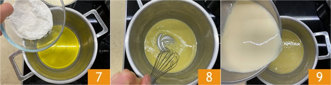 Meanwhile, make the vegan béchamel: heat the oat milk in a small saucepan until it just comes to a simmer. In a separate small saucepan pour the oil and rice flour 7. Whisk over low heat to form a roux; it will take a couple of minutes at most 8. At this point incorporate the plant beverage 9.