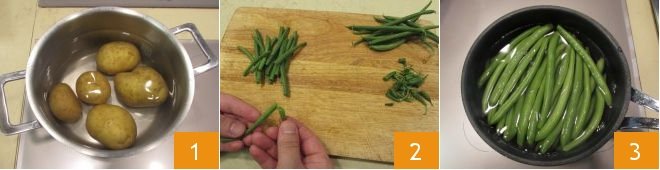 To make the Ligurian meatloaf, first thoroughly wash and then boil the potatoes for 40 minutes, starting with cold water 1; cook until they are soft when pierced with the prongs of a fork, the timing may vary depending on the size of the potatoes. Wash and trim the green beans 2, then cook them separately in a pot with water for about 25 minutes 3, always starting with cold water. They should be tender by the end of cooking without falling apart.