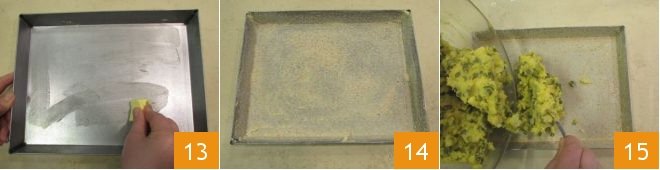 Now butter a rectangular baking dish of 12x9 inches 13 and sprinkle the bottom and edge with breadcrumbs 14. Pour the mixture into the baking dish 15,