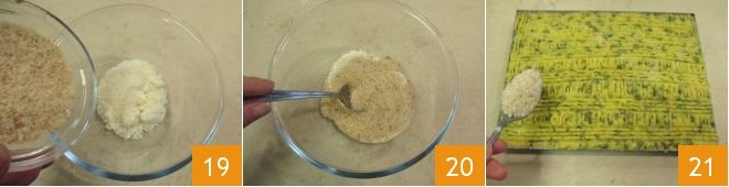 Now in a bowl, combine the grated Parmesan and breadcrumbs 19, mix 20 and spread the obtained mixture over the surface 21.