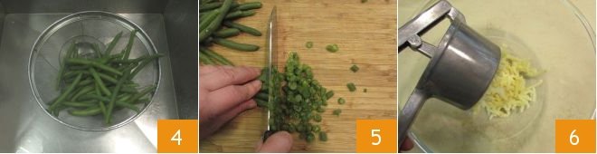 Once the green beans are ready, drain them 4 and cut them into small pieces 5. Meanwhile, the potatoes will also be cooked, drain them and pass them through a potato masher, collecting the puree in a large bowl 6.