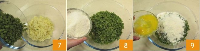 Add the cooked green beans here as well 7, add the grated cheese 8 and the eggs 9.