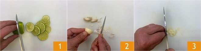 To prepare lime and mint chicken, first wash the lime well and slice it 1. Then peel the garlic 2 and slice it 3.