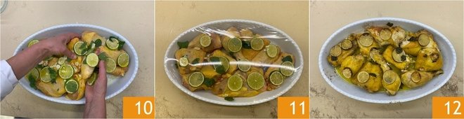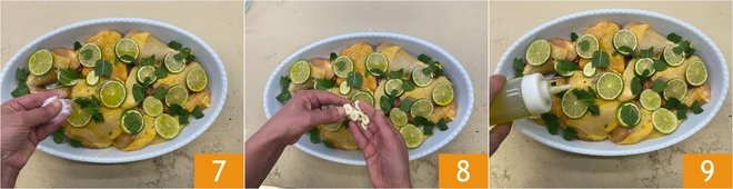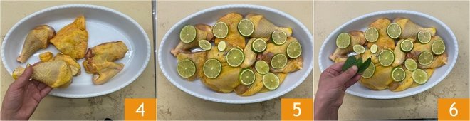 Place the chicken pieces in a baking dish 4, add the lime slices on top 5, and the mint leaves 6.