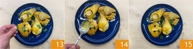 It's time to plate. Transfer the chicken pieces to a serving dish, add more mint leaves, tearing them by hand 13, pour the cooking juices over 14, and serve 15.