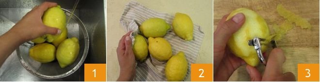 To make the limoncello, wash the lemons under running water 1, rub the peel with a clean sponge to remove any dirt, then dry the lemons with a cloth 2. Peel the lemons with a potato peeler, taking care to take only the yellow peel and not the bitter white part known as the pith 3.