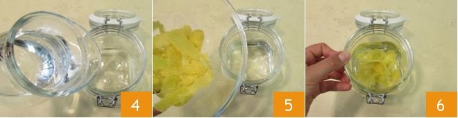 Pour the alcohol 4 and lemon peels 5 into an airtight glass jar, close the lid 6 and leave the peels to steep for 30 days in a dark place away from heat sources.