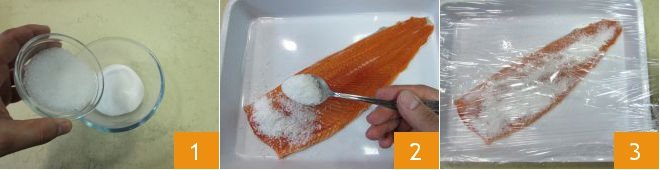 To prepare the Mergozzo gold bar, first, focus on marinating the fish. In a bowl, pour the sugar and coarse salt 1 and mix everything. Spread the mix over the trout fillet with skin 2, cover with plastic wrap and refrigerate for 6 hours 3. Now, if you wish to make the black bread powder needed for decoration, this is the right moment; you'll find the box at the end of the recipe.