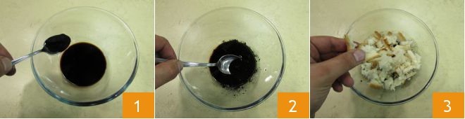 To prepare the black bread, first pour the balsamic vinegar into a bowl and add the activated charcoal 1. Stir with a teaspoon to dissolve it 2. Crumble the sandwich bread inside 3