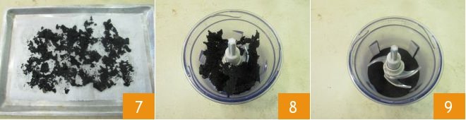 Once it is well dried, take it out of the oven 7 and let it cool. Then transfer it inside a blender with blades 8 and reduce it to powder 9.