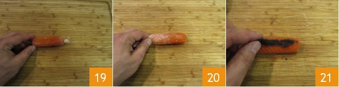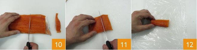 At this point, take back the trout fillet, trim it 10, then cut a slice and then pass the knife between the flesh and skin to remove the latter. From the slice, cut out precise rectangular shapes 11. Wrap each one individually in plastic wrap 12,