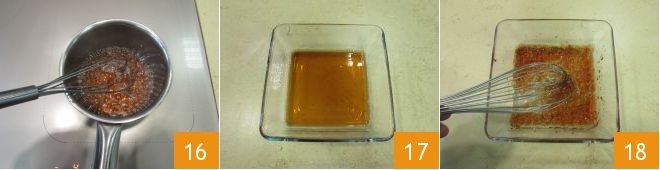 and let it dissolve by moving the saucepan on the fire or mixing with a whisk 16. Let it boil for a few moments. Pour the liquid obtained into a small tray 17 and let it set for 1 hour at room temperature. After this time, make it fluid again using a hand whisk 18 and store inside a pastry bag in the refrigerator.