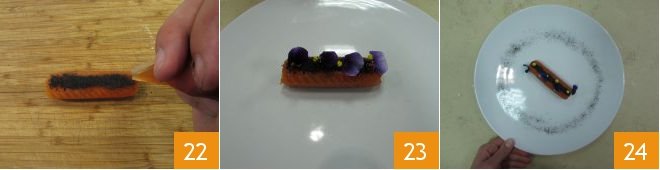 Also place 4 drops of jelly on top 22. Decorate with edible flowers 23 and place a bit more black bread around 24. The Mergozzo gold bar is ready to be served.