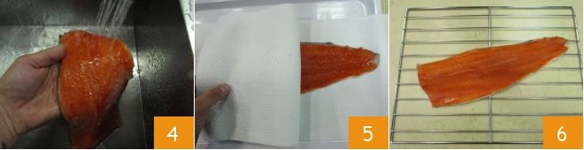 After the marinating time, rinse the fillet under running water 4 and dry it thoroughly 5 before transferring it to an oven rack 6.