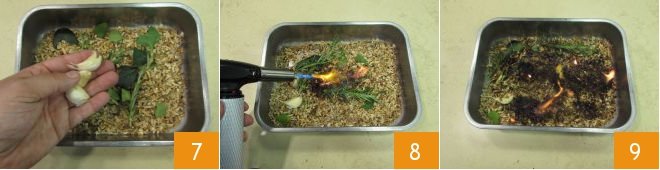 In a baking tray, pour the beech sawdust, a sprig of rosemary, 2-3 bay leaves, a broken sprig of sage, 3 crushed garlic cloves 7. Mix everything with your hands and burn with a blowtorch (8-9). Move it around a bit with tongs and transfer the tray to the bottom of the oven. Place the fillet on the rack positioned at the top of the oven and let it smoke for 2 hours with the oven turned off.