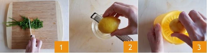 To prepare swordfish and lemon linguine, first place a pot filled with water on the stove, salted to taste, which will be used for cooking the pasta. Then chop the parsley 1, grate the lemon zest 2, and squeeze out the juice 3.