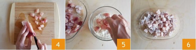Set everything aside and take care of the swordfish. Remove the outer skin and cut it into cubes 4. Then pass the cubes in flour (5-6).