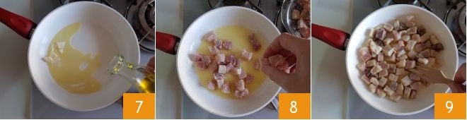 In a large pan, pour in butter and oil 7, heat until the butter melts, and as soon as it's melted, add the swordfish cubes 8. Let it cook over low heat for about 8 minutes 9, turning well for even cooking.