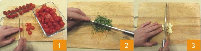 To prepare linguine with confit tomatoes, start by washing the cherry tomatoes and cutting them in half 1. Also, prepare some thyme 2 and coarsely chop the garlic 3.