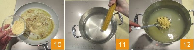 Let them melt over low heat, then add the breadcrumbs 10 and let them toast for a few minutes. In the meantime, cook the linguine in plenty of salted boiling water 11, and drain them al dente 12.