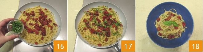 And the basil torn into pieces 16. Sauté the linguine with confit cherry tomatoes for a few minutes 17, then plate them and enjoy them hot 18!