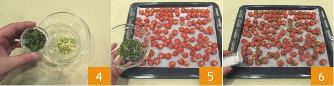 In a small bowl, combine the garlic 4 and thyme and mix them together with the oregano. Meanwhile, place the cherry tomatoes cut side up on a baking sheet lined with parchment paper and sprinkle them with the herb mixture 5. Dust the cherry tomatoes with sugar, pepper, and salt 6.