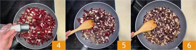 Season with salt 4 and let it evaporate 5. Continue cooking for another 3-4 minutes until the radicchio is tender 6.