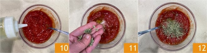 In the meantime, prepare the topping: pour the peeled tomatoes into a bowl and season with oil 10, salt, and oregano 11, then mash and mix with a fork 12.